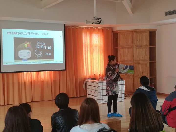 本次活动可称为亲子阅读讲座,近百位大小听众将报告厅坐的满满的,何老师讲述了如何从绘本入手,感受孩子世界的不同;如何从理解绘本开始,走进孩子的心灵;并与年轻的父母们一道探索阅读的方法,共享亲子阅读的美好。何老师精彩而生动的语言,配以ppt上精美绘本图片,宛如细说一个个绘本故事,连孩子们也在会场静听了三十分钟。