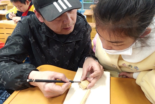 何老师首先拿出自己创作的多幅竹刻作品,给同学们欣赏,让同学们直观感受“阴刻与阳刻”的魅力。接着何老师借助板书给同学们示范、讲解什么叫“阴刻”与“阳刻”,同学们听得很专注。接下来到了同学们最期待的动手操作时间,老师给每个同学发了专用刻刀和小竹牌,手把手地指导同学们体验竹刻,学习刻刀的用法,讲解竹刻技艺的要领。出于对小学生的安全考虑,何老师还专门设计的防护用具,可谓非常细心。只见同学们埋头刻着竹牌,那专注的深情俨然是一个个金陵竹刻的小小传承人。大约过了半小时,动作快的同学已经初步完成了一个“福”字竹牌的阳刻作品,非常自信地拿给老师和同学展示。个别同学动作稍慢,老师也很有耐心,一对一辅导,直至作品完成。