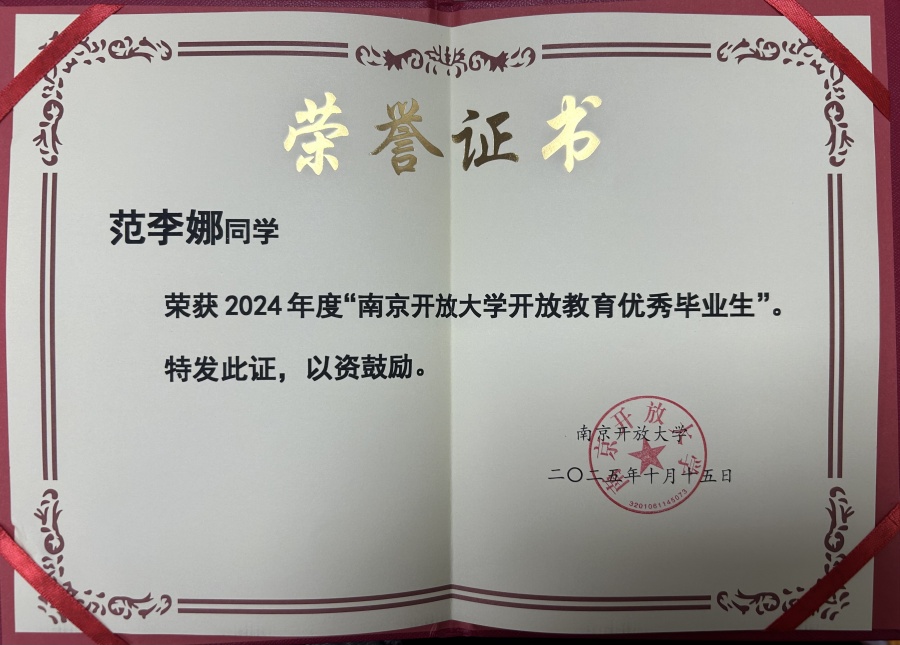 根据《关于开展2024年度南京开放大学优秀毕业生评选推荐活动的通知》相关文件精神,我校按照通知要求组织了2024年度优秀毕业生的初评和推荐工作。市校优秀毕业生评选小组评审并公示,决定授予我校范李娜学员“2024 年度南京开放大学米兰平台优秀毕业生”称号。